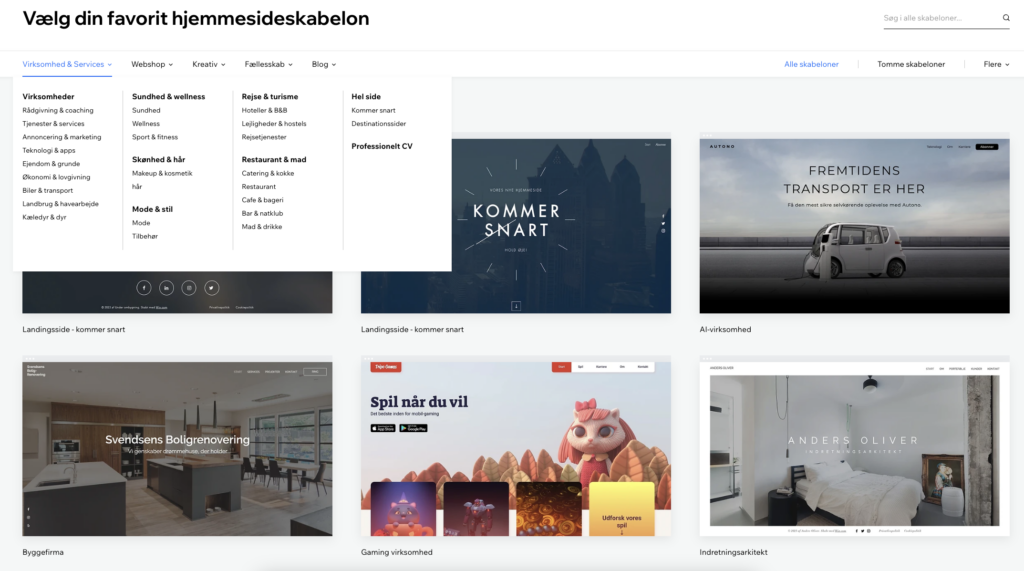 Wix tilbyder et bredt udvalg af skabeloner, der er skræddersyet til forskellige brancher. Wix har skabeloner til restauranter og caféer, skønhedssaloner, musikere, fotografer, og små virksomheder inden for detailhandel. Arbejder du inden for rejse- og turismeindustrien, som hoteller, rejsearrangører eller campingudbydere, kan du finde også skabeloner, der passer perfekt til dine behov.